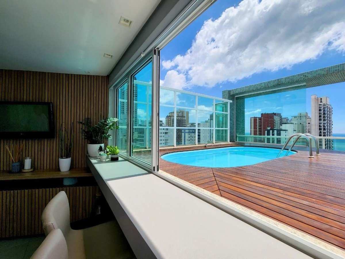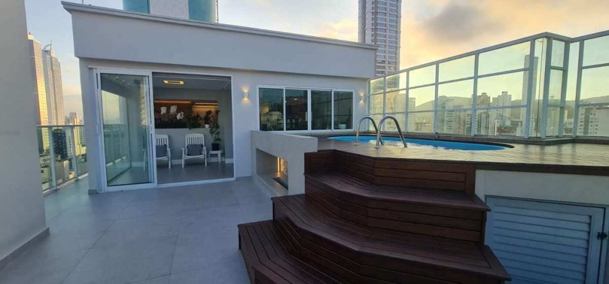 Terraço com piscina privativa, deck em madeira e ampla área de lazer