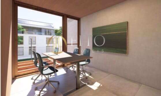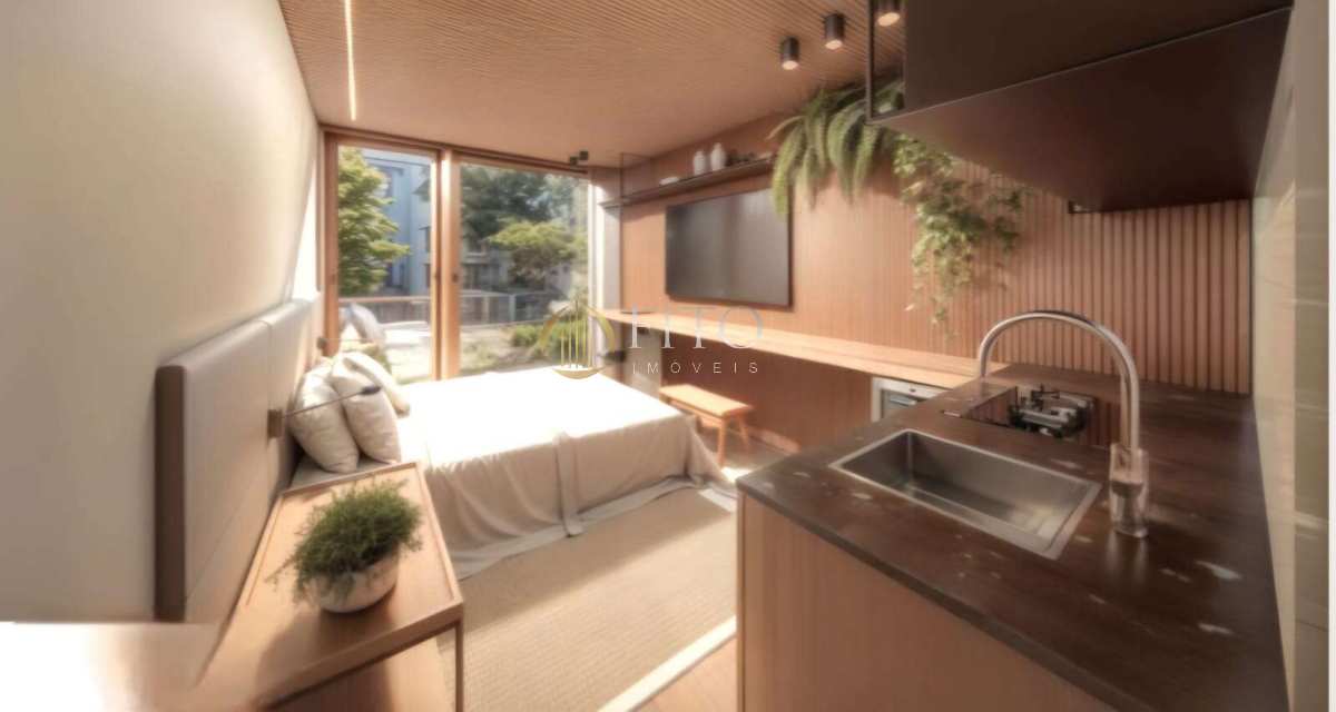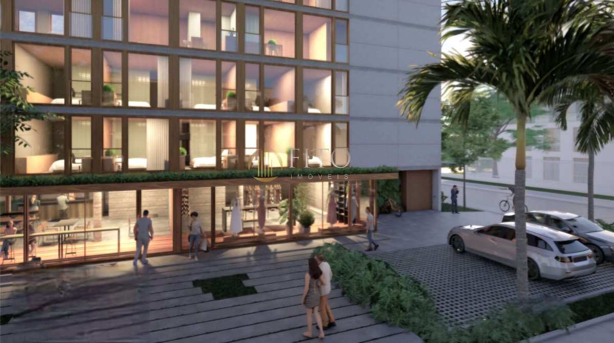 Studio na esquina da Búzios com a Prof. Renato Barbosa, andar alto, mobiliado, face norte com 17,07 m2. Hall de entrada, coworking e piscina com deck. Entrega prevista para agosto/2027.